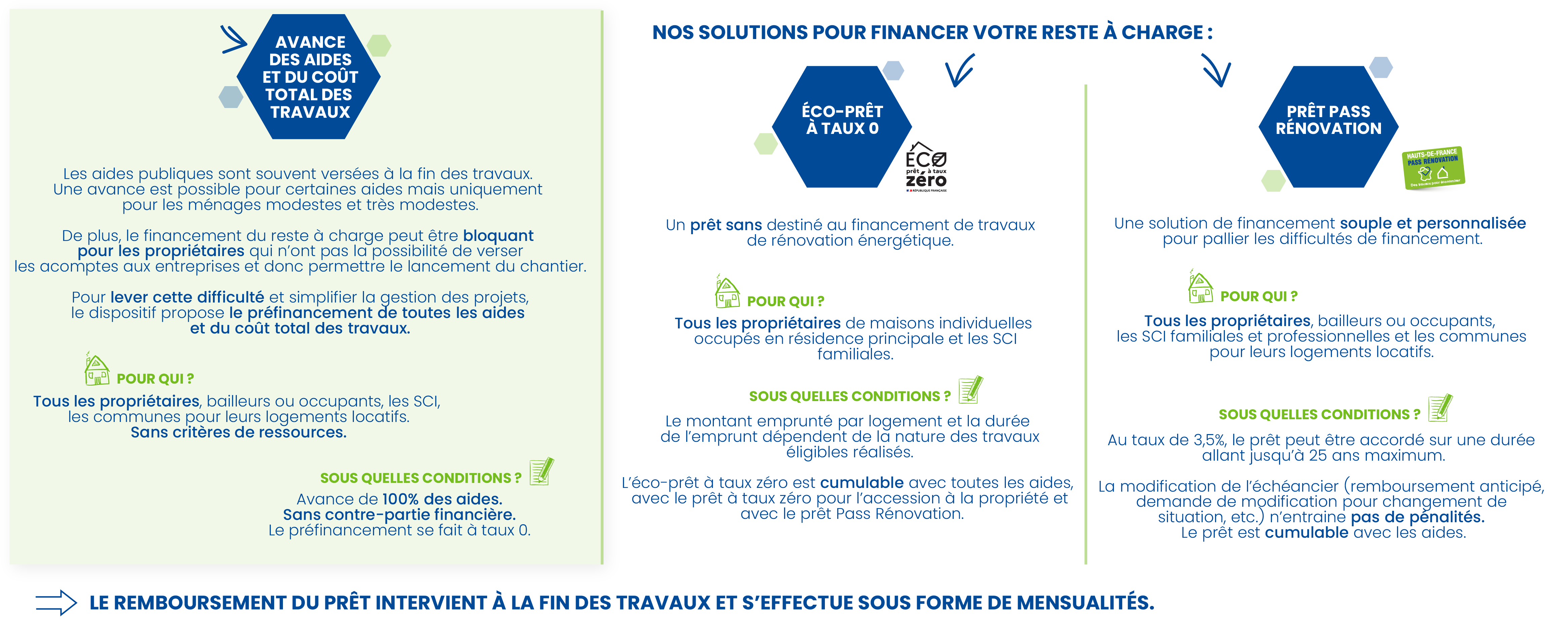 Pour les propriétaires souhaitant engager des travaux mais ne disposant pas de financement, le dispositif Hauts-de-France Pass Rénovation propose diverses solutions de financement2 : préfinancement du montant des travaux et des aides mobilisables, éco-prêt à taux zéro3, prêt de tiers-financement4 avec étalement possible jusqu’à 25 ans, etc.. Le remboursement démarre à la fin du chantier par des mensualités qui tiennent compte des économies d’énergie estimées lors de l'audit énergétique.